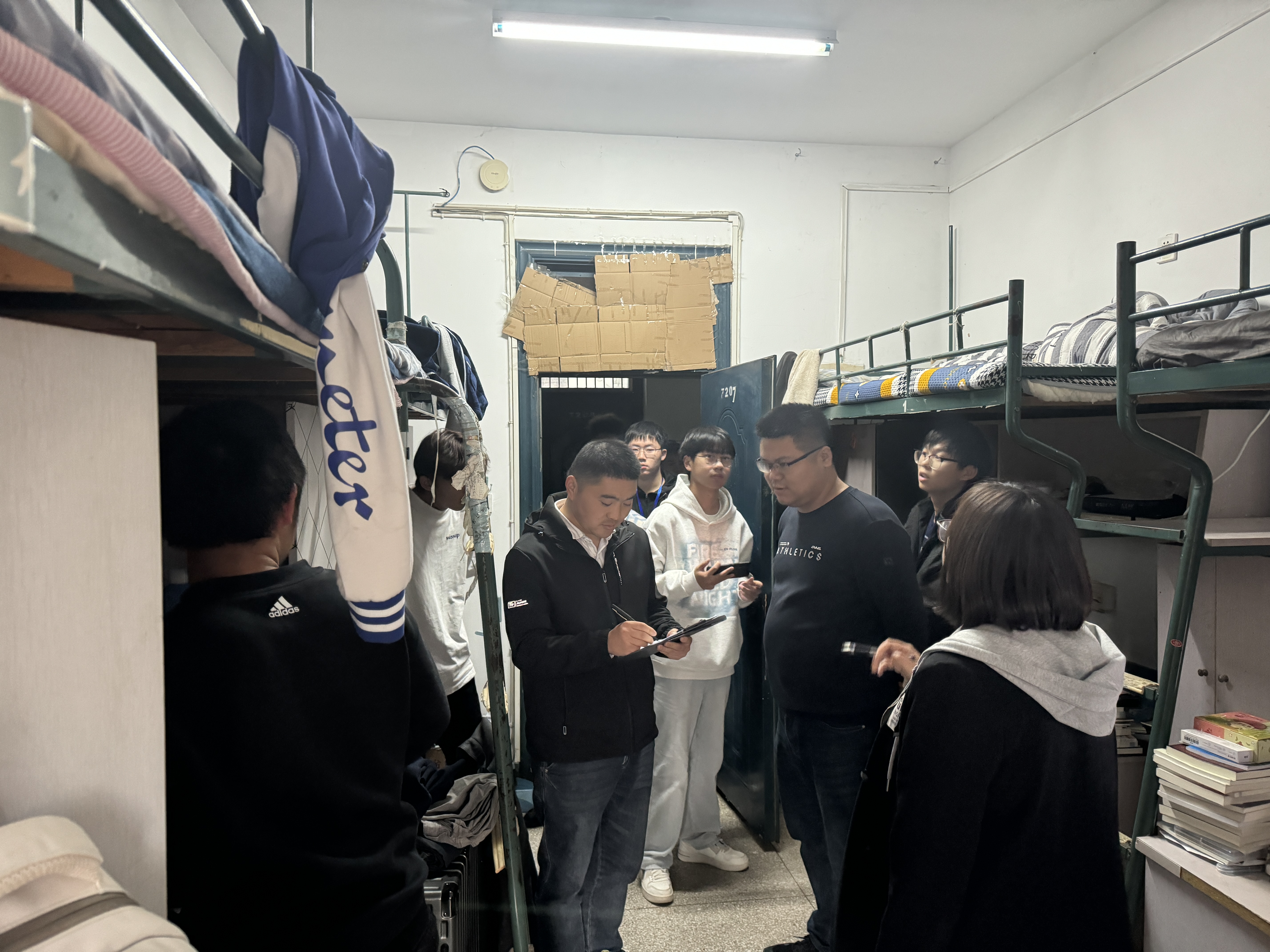检查过程中,各位老师集体深入各宿舍楼,逐一查看学生宿舍的卫生情况、用电安全、消防安全等方面。重点检查了宿舍内是否存在违规电器、私拉电线、堆放易燃易爆物品等安全隐患,以及宿舍卫生是否干净整洁、物品摆放是否整齐有序。对存在的问题,现场提出整改意见。检查结束后,学院及时对检查出的问题进行汇总、通报,并要求相关班级辅导员及时跟进、快速处理、加强教育。
