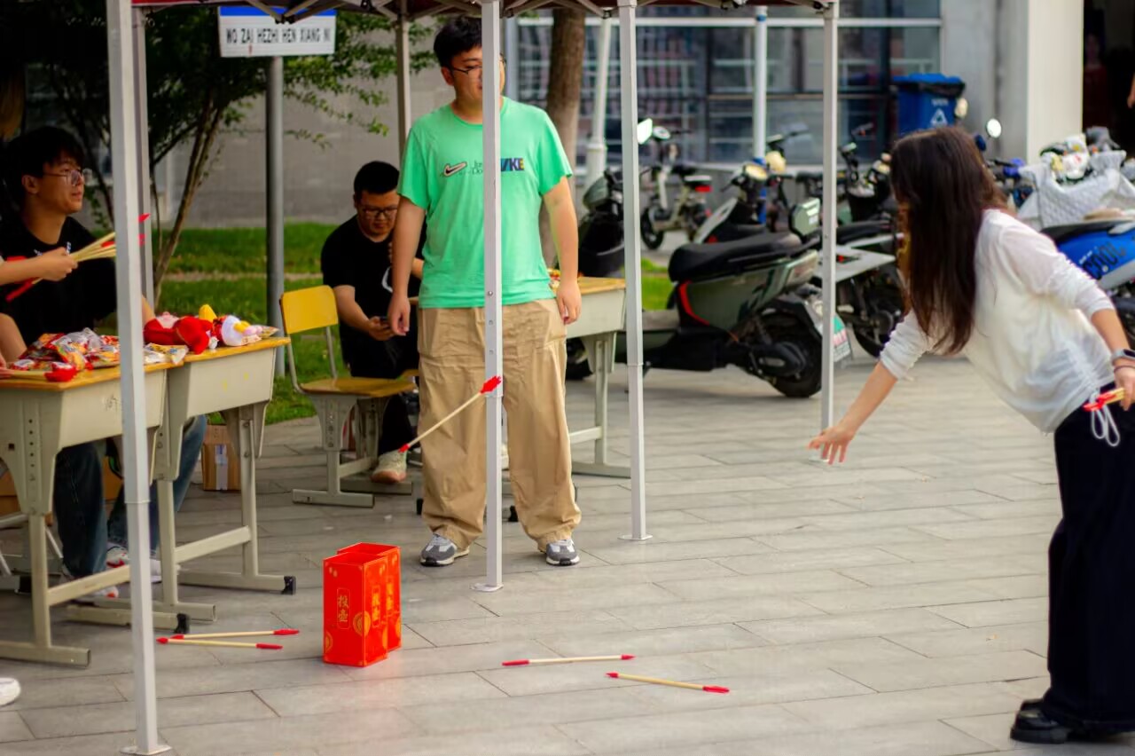 下午四点活动开始,活动现场投壶区域古风古韵十足。志愿者们精心准备了壶具和箭矢,还原了古代传统投壶游戏的场景。同学们纷纷上前一试身手,他们或屏气凝神、专注瞄准,或潇洒一掷,展现出不同的投壶姿态。随着箭矢入壶,现场不时响起阵阵欢呼与掌声。参与的同学不仅在游戏中感受到了古代文人雅士的休闲乐趣,更增进了对传统文化的了解与热爱。