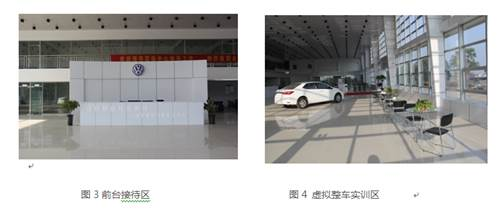 1、汽车销售仿真实训区域 根据一汽大众品牌的环境布局,工作岗位流程通过一定的软硬件配置,加上一些效果装修,把企业的真实工作环境带入到校园中,使学生在校园内就能直接进行汽车4S店相关工作内容操作。该实训区域内设前台接待区、虚拟整车训练区、商务洽谈区、客户休息区、配件实训区、保险理赔实训区、维修接待区、财务结算区以及教学区等,并配置四台大型触摸式电子显示器、智能录播系统以及具有虚拟现实技术制作的十四套教学软件。