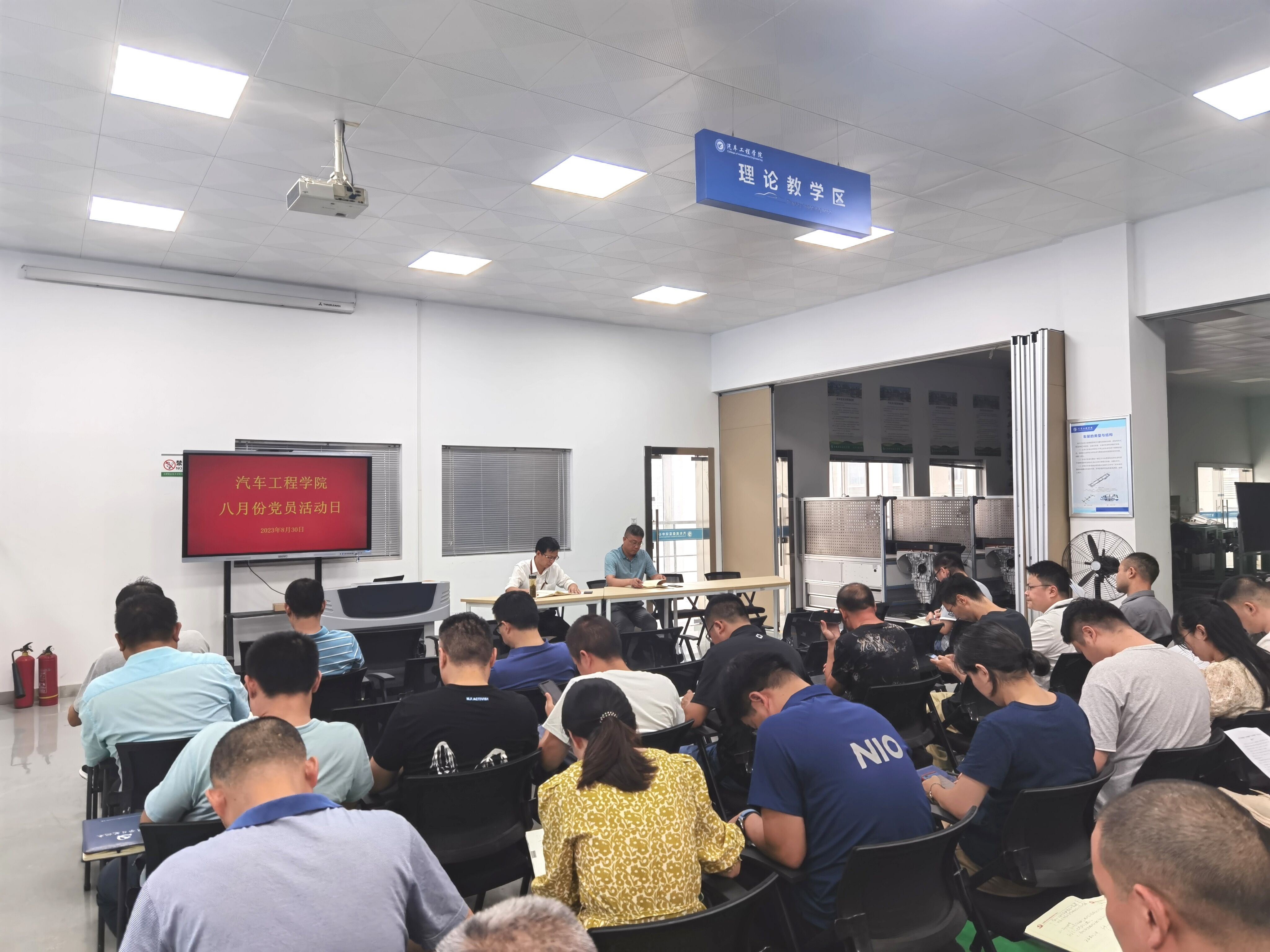 为深入学习宣传贯彻习近平新时代中国特色社会主义思想和党的二十大精神,8月30日下午,永利集团304am登录党总支组织全体党员在汽车楼实训室302开展八月份主题党日活动,学校党委委员、办公室主任、学院党总支书记王海主持会议。