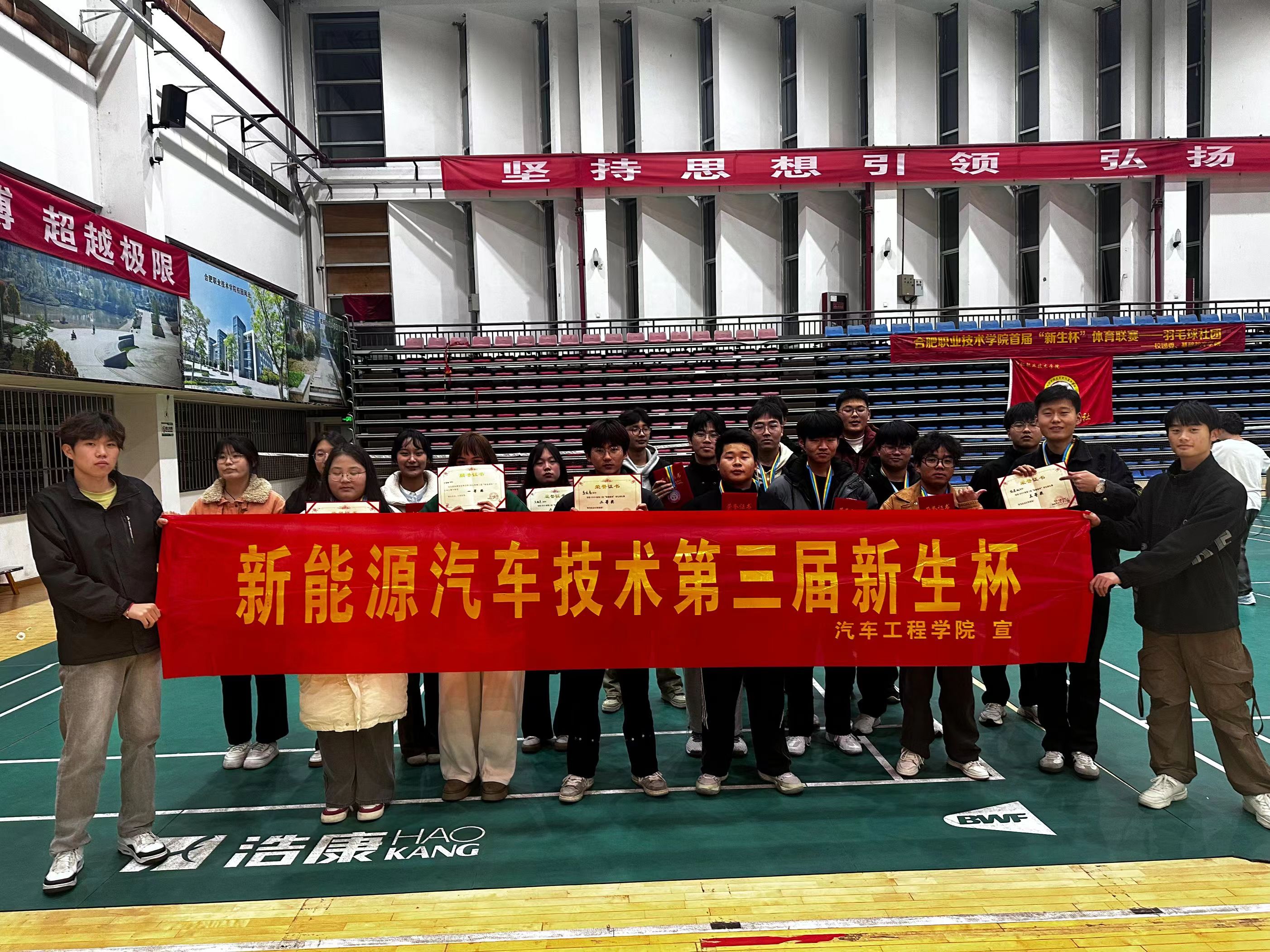 在决赛场上,选手们奋力拼搏,虽是严冬,但他们依然汗流浃背;场下,他们互相鼓励、相互支持,都展现出了积极向上的精神风貌和良好的体育素质。经过一轮又一轮的激烈比拼,最终由来自23新能源2班的黄坤鹏获得男生组第一名,23新能源3班的王寒钰获得女生组第一名,本次“新生杯”羽毛球赛精彩落幕。